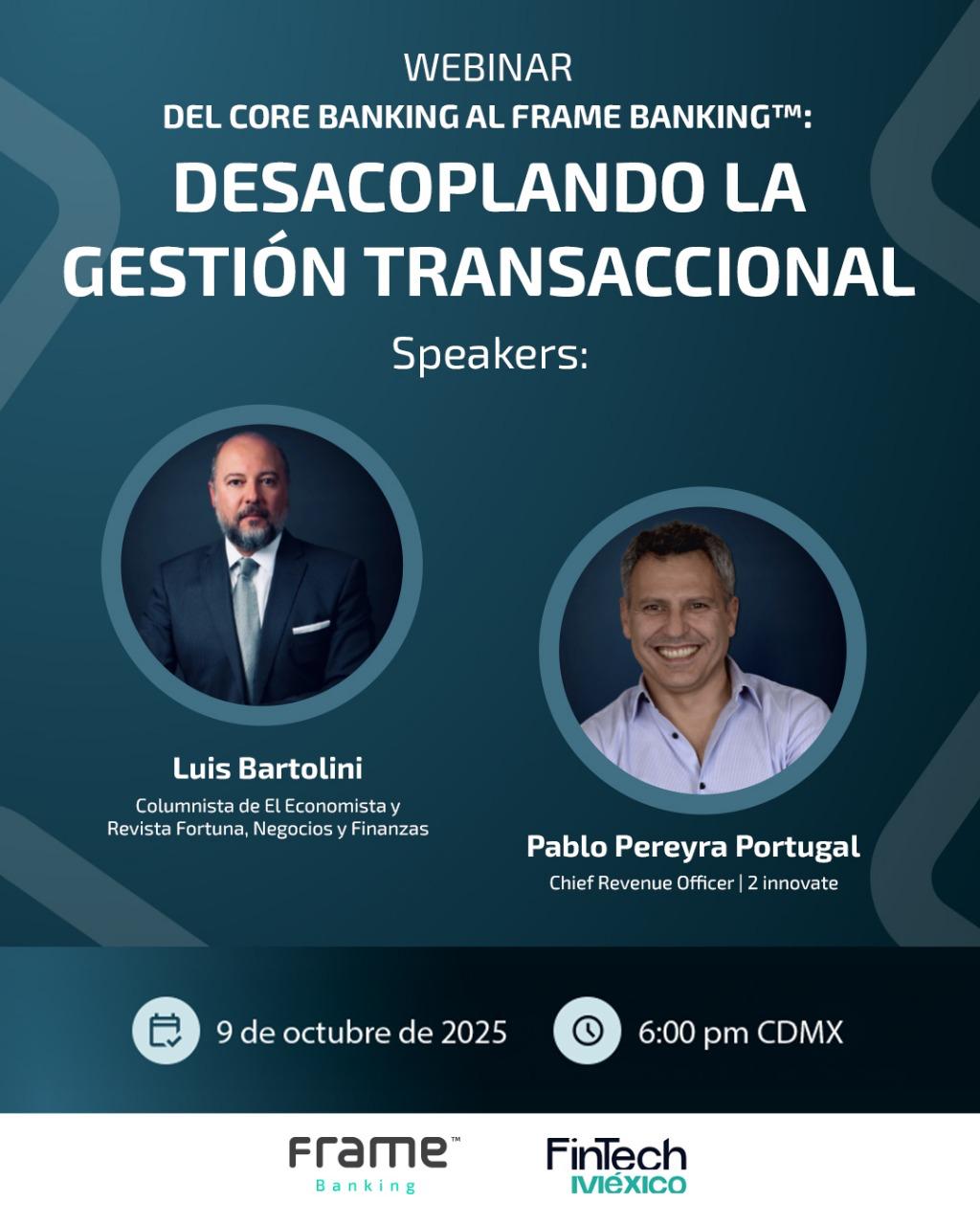 En este webinar, impulsado por Fintech México, conversaremos con Luis Bartolini, columnista de El Economista y Revista Fortuna, Negocios y Finanzas, y Pablo Pereyra Portugal, Chief Revenue Officer de 2innovate, sobre cómo las instituciones financieras en América Latina están dando este paso, creando ecosistemas transaccionales más ágiles, reduciendo costos y abriendo la puerta a nuevas oportunidades de negocio.